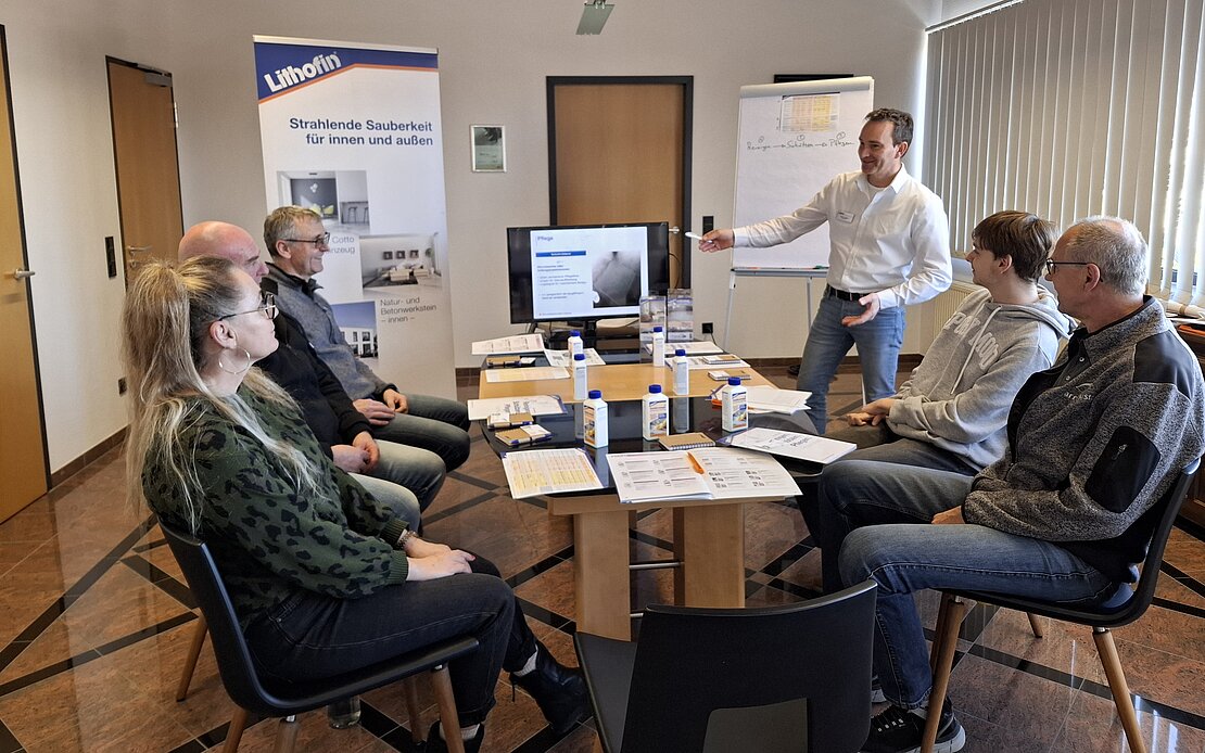 Gebietsleiter Stefan Hägele konnte 7 interessierten Mitarbeitern und auch Herrn Armbruster Wissenswertes über das Lithofin-Produktportfolio erklären.