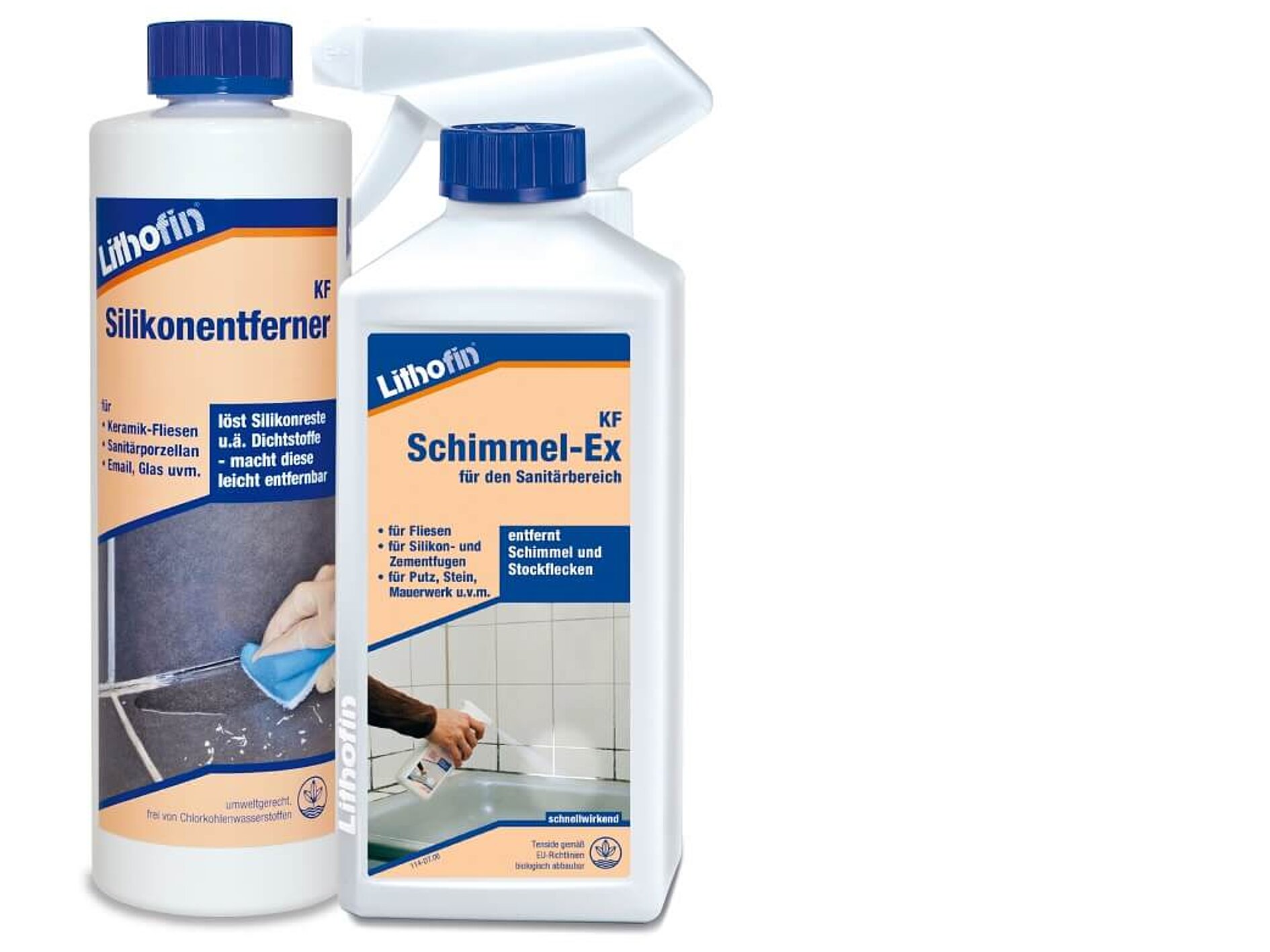 Sie möchten sicher sein, dass Sie Schimmel von Silikonfugen zuverlässig entfernen? Ist der Befall so stark, dass Sie selbst die Fugen entfernen müssen? Dann haben wir für Sie genau das Richtige: das neue Lithofin Reiniger-Set zum Entfernen von Schimmel von Silikonfugen zum vollständigen Entfernen von Silikonfugenresten und dem zuverlässigen Beseitigen von Schimmelsporen auf Ihren wasserbeständigen Oberflächen.