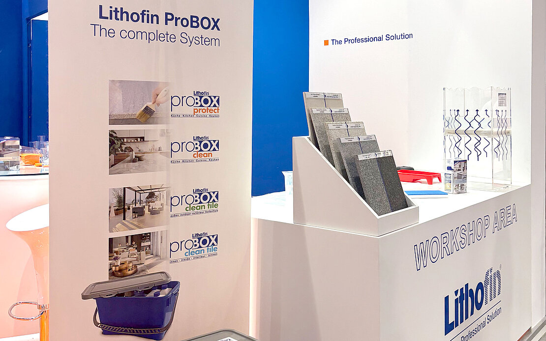 L'accent a été mis sur le système Lithofin de nettoyage, de protection et d'entretien qui, avec les quatre différentes Lithofin ProBox, offre la solution idéale pour chaque applicateur.