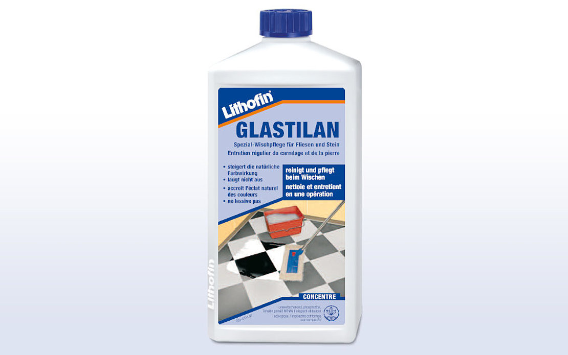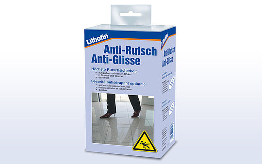 Effectuez d'abord un nettoyage de base. Si la douceur du revêtement de sol est due à des produits d'entretien formant des couches, ce nettoyage suffit à résoudre le problème. Si le sol est encore trop glissant, on peut utiliser du Lithofin Anti-Glisse pour rendre la surface plus antidérapante. Une plus grande rugosité est obtenue en éliminant les plus petites particules de silicate. Lithofin Anti-Glisse est disponible dans un set qui contient tout ce dont vous avez besoin pour une finition antidérapante d'environ 6m².