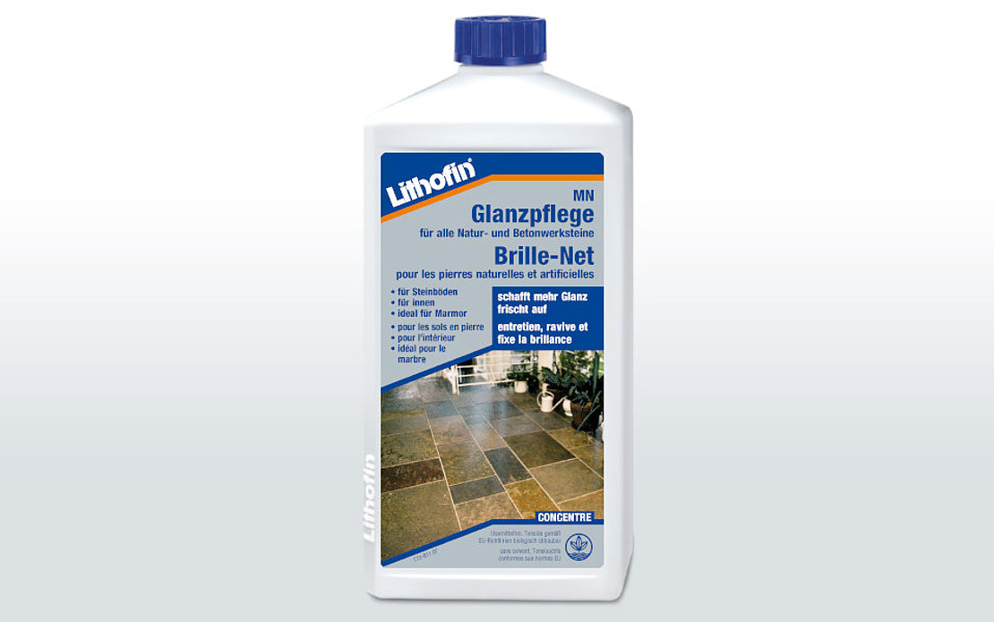 Premièrement, enlever toutes les taches et traces de détergeant avec Lithofin MN Multi-Nettoyant. Ensuite, recouvrir la surface avec Lithofin MN Brille-Net (Sur les endroits très abîmés, appliquer Lithofin MN Auto-Brilllant dilué avec de l’eau : 1:4). Il est possible que vous ayez à répéter cette opération pour obtenir un brillant optimal. Utiliser Lithofin MN Wash & Clean pour l’entretien régulier.