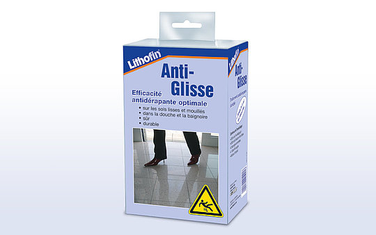 Effectuez d'abord un nettoyage de base. Si la douceur du revêtement de sol est due à des produits d'entretien formant des couches, ce nettoyage suffit à résoudre le problème. Si le sol est encore trop glissant, on peut utiliser du Lithofin Anti-Glisse pour rendre la surface plus antidérapante. Une plus grande rugosité est obtenue en éliminant les plus petites particules de silicate. Lithofin Anti-Glisse est disponible dans un set qui contient tout ce dont vous avez besoin pour une finition antidérapante d'environ 6m².