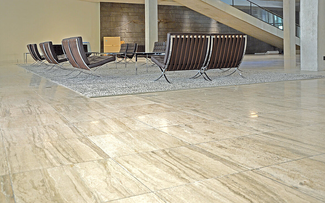 Als onderdeel van de renovatie werd een totaal oppervlak van 2.500 vierkante meter geslepen Travertin kalksteen hersteld in zijn oorspronkelijke staat.