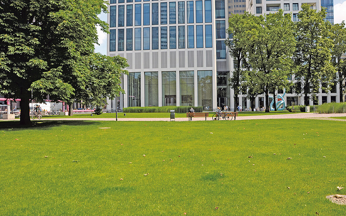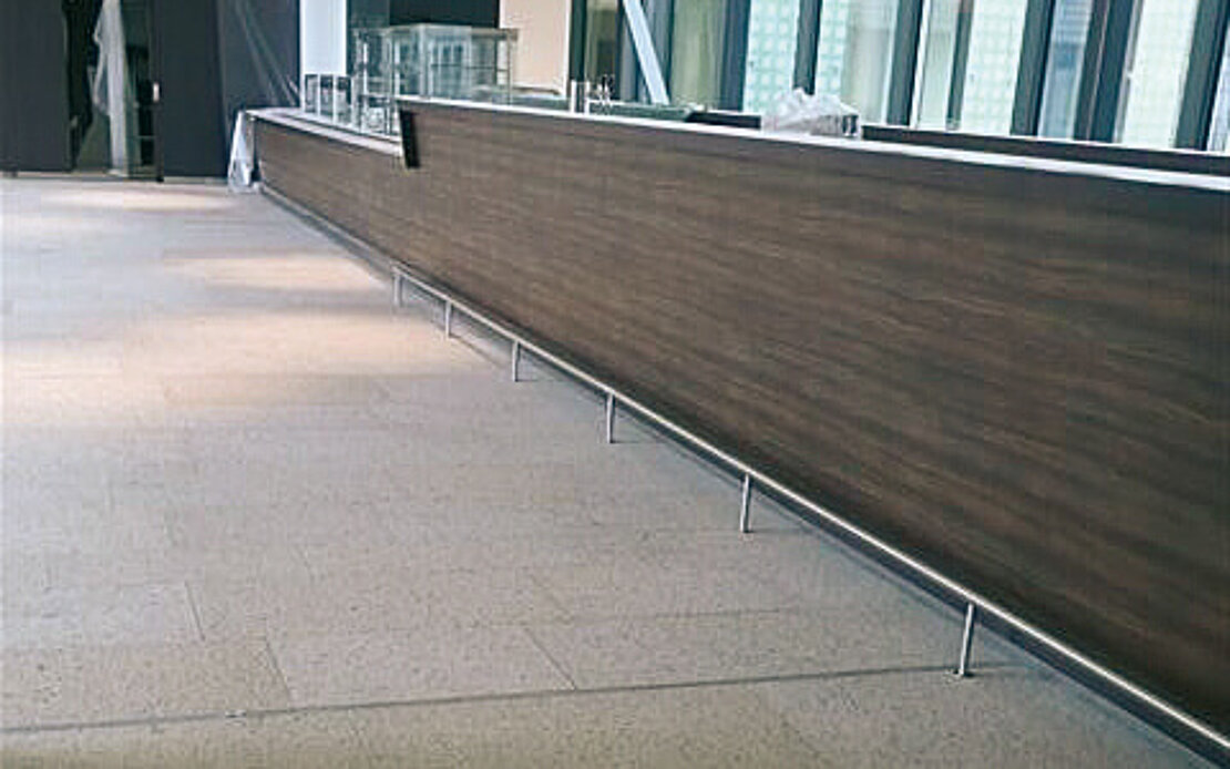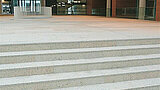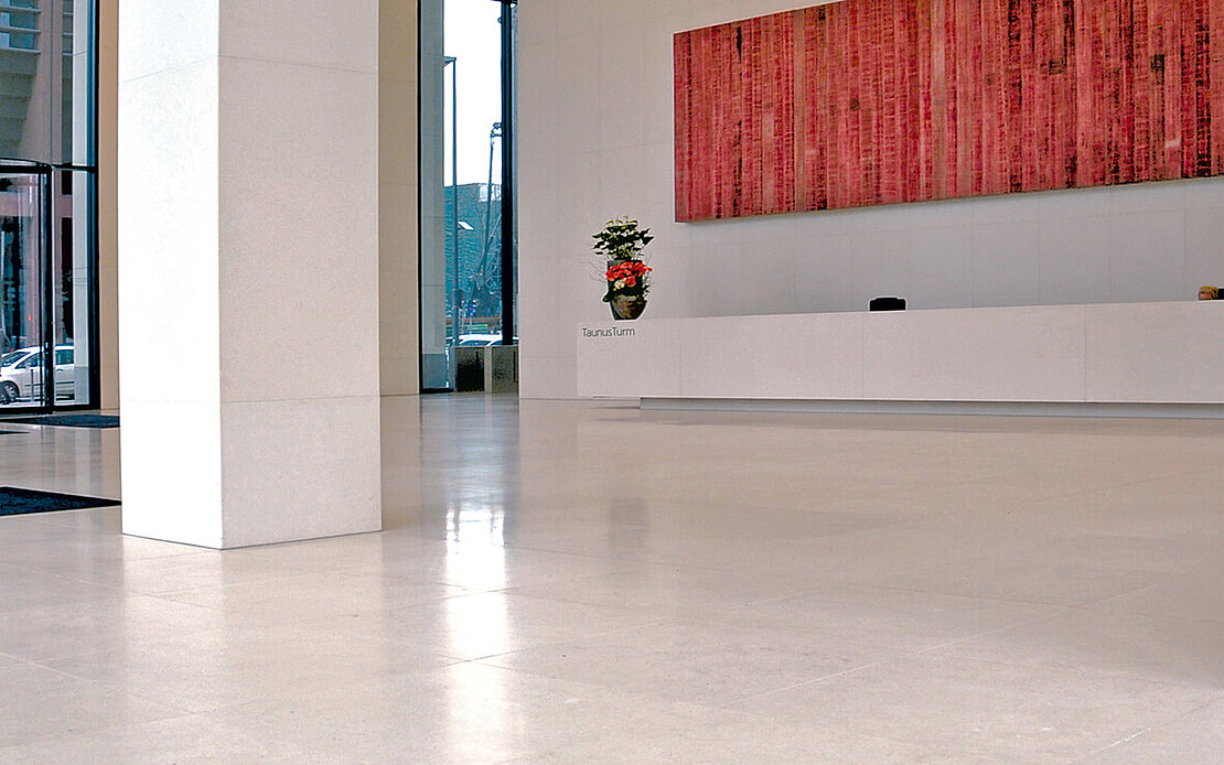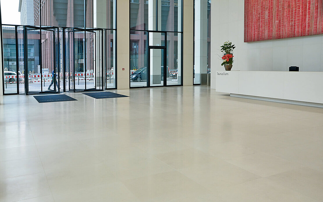 De vloer van de foyer werd ontworpen met Anröchter Grün kalksteen, afkomstig uit Duitsland. De grijsgroene kleurstelling geeft de entree een vleugje puristische elegantie. Om het materiaal effectief te beschermen tegen water-, olie- en vetvlekken, werd op een oppervlakte van ca. 1.000 m² Lithofin STAINSTOP >W< aangebracht. De impregnering op waterbasis beschermt absorberende keramische, natuur- en betonsteenbekledingen tegen vlekken. Bovendien vergemakkelijkt het de verdere onderhoudszorg.
