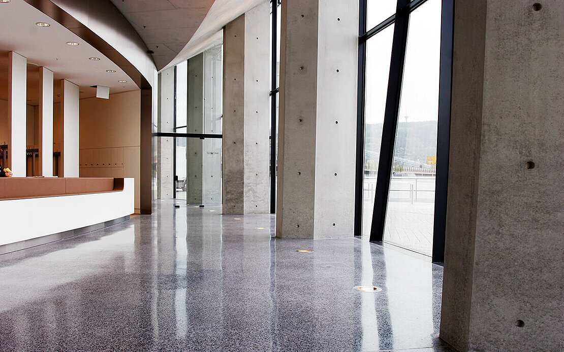 De vloer van de foyer werd ontworpen met Anröchter Grün kalksteen, afkomstig uit Duitsland. De grijsgroene kleurstelling geeft de entree een vleugje puristische elegantie. Om het materiaal effectief te beschermen tegen water-, olie- en vetvlekken, werd op een oppervlakte van ca. 1.000 m² Lithofin VLEKSTOP >W< aangebracht. De impregnering op waterbasis beschermt absorberende keramische, natuur- en betonsteenbekledingen tegen vlekken. Bovendien vergemakkelijkt het de verdere onderhoudszorg.