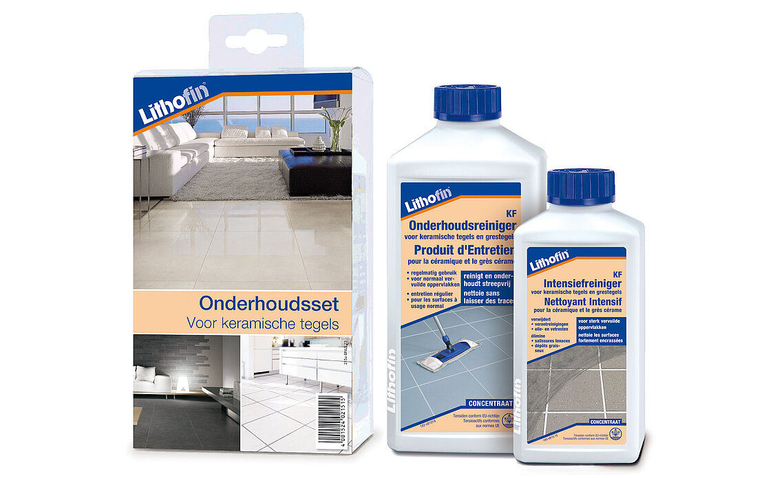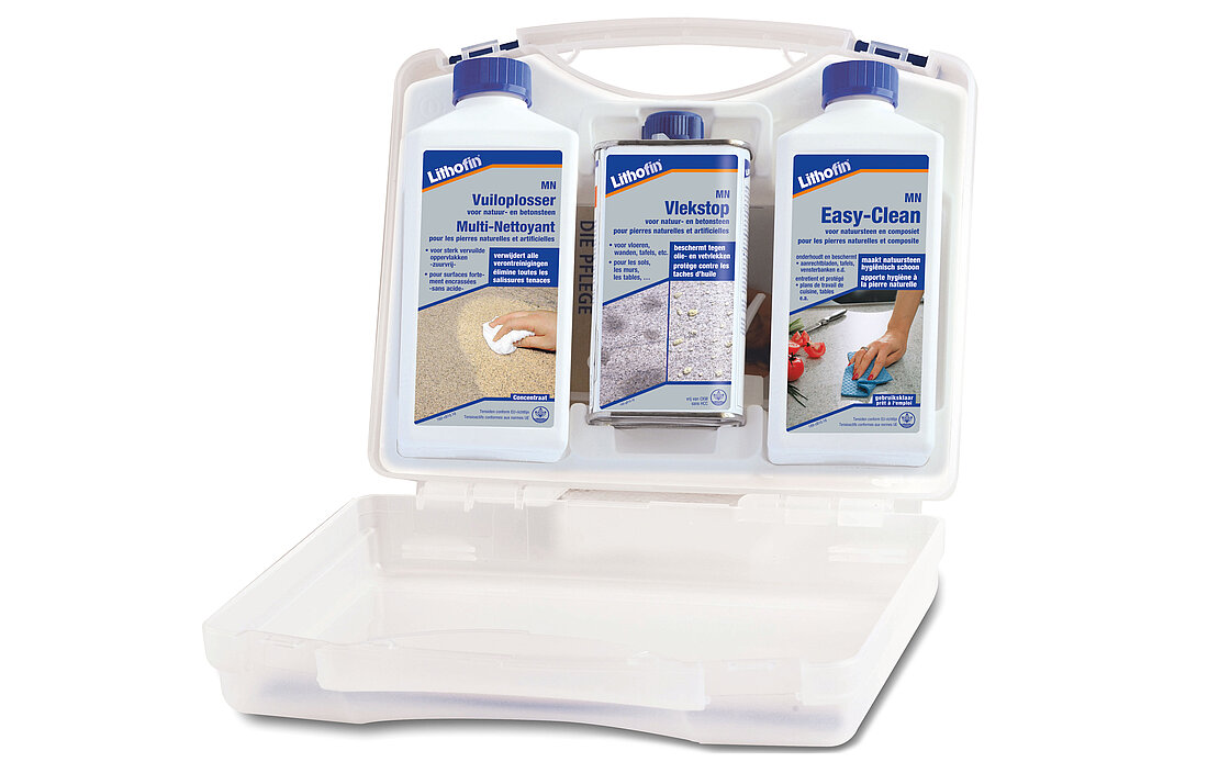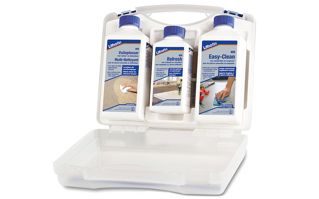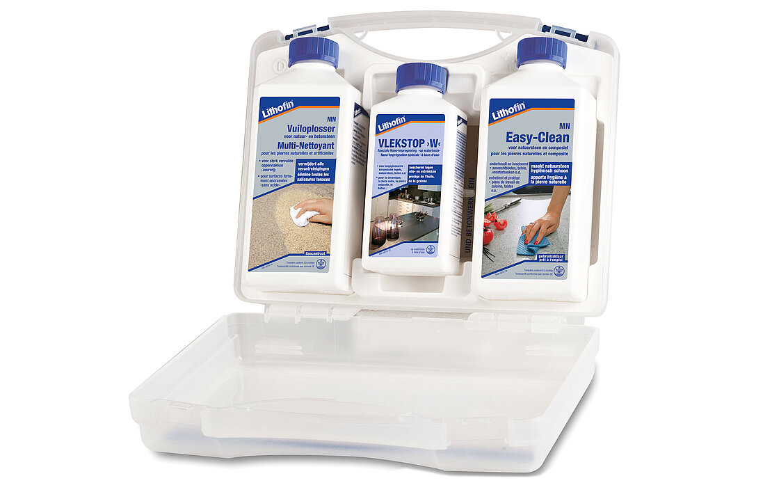 Lithofin onderhoudssets bevatten producten die zijn afgestemd op het toepassingsgebied, zoals keukenwerkbladen, badkamers of vloerbedekking.